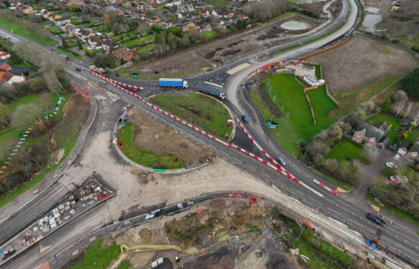The traffic management will return to the arrangement is has been for some time with traffic using the roundabout Southbound and the old road Northbound with 2 way flow from 22 February. Under this arrangement, during week commencing 23 February there will be a significant amount of surfacing work on the West side of the roundabout to construct further layers of the carriageway construction.